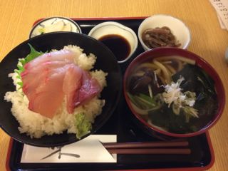 1級の試験が終わると昼食休憩。駅の近くで食べようと思ったが、時間が時間なのでもちろんどこも満員に近い感じだった。結構歩いて、商店街も外れにくると、一件良さそうな店があったので、そこに決める。ヒラマサ刺身丼とうどんのセット。和食の店の様だ。